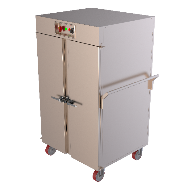 SG Equipments Hot Food Trolley is made from AISI304 Food Grade Stainless Steel. Constructed around vertical Square Pipes 30x30x1.5mm THK, and cladded on the sides and rear with double layer 1mm THK stainless steel sheets with insulation. The doors are made from a double layer 1.2mm THK stainless steel sheet on the exterior and closed with 1mm THK sheet on the back, with insulation. The doors are hinged on the sides and are also provided with locking facility. The control panel is made from 1.2mm THK stainless steel sheet and is positioned above the doors on the front. The control panel is equipped with a rotary On/Off switch, an analogue thermostat for temperature control and a couple of light indicators. Two handles of the stainless steel pipe Ø25×1.5mm THK is provided on both the sides. The Hot Food Trolley is equipped with four numbers of all swivel castor wheels Ø150mm at the bottom two of which are with brakes. 25x25x16G SS angle is provided in each inner compartment to accommodate (Tray, GN Pans Containers, and Thali etc.).