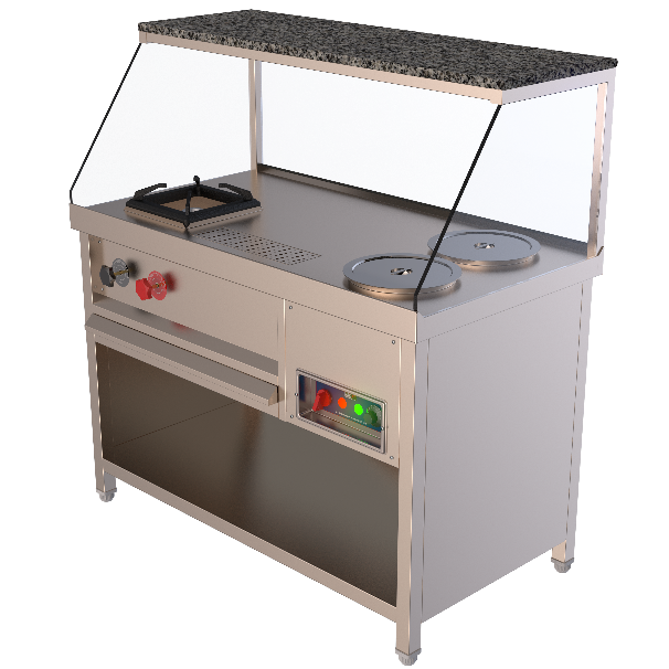 The Tea & Coffee Counter is made from AISI304 Food Grade Stainless Steel. It is provided with front and side toughened glasses of 10mm THK. The Tea & Coffee counter is provided with a burner and a vessel rest of 250x250mm as an option. The top serving shelf can be of glass of same thickness as the front and sides or of granite. The top serving shelf is supported on Square Pipe 30x30x1.5mm THK frame. Tea & Coffee counter is constructed around an internal frame consisting of vertical square pipes 40x40x1.5mm THK as legs and angle iron 32x32x3mm THK as cross members. The undershelf provided is made from 1.2mm THK stainless steel sheet and double beaded on all sides. The internal frame is cladded with 1mm THK stainless steel sheet on the front and sides. The top panel is made from 1.5mm THK and raised by 20mm at the front. The Top Panel is provided with a drain and a perforated cover. On the rear side a recessed control panel of 1.2mm THK is provided for the burner controls. A spillage tray of 1mm THK and hemmed on all sides, is provided under the recessed control panel. The Tea & Coffee counter is provided with a hot chamber with 2 round containers. A separate control panel is provided for the hot chamber with a rotary ON/Off switch, an analogue thermostat and two light indicators.